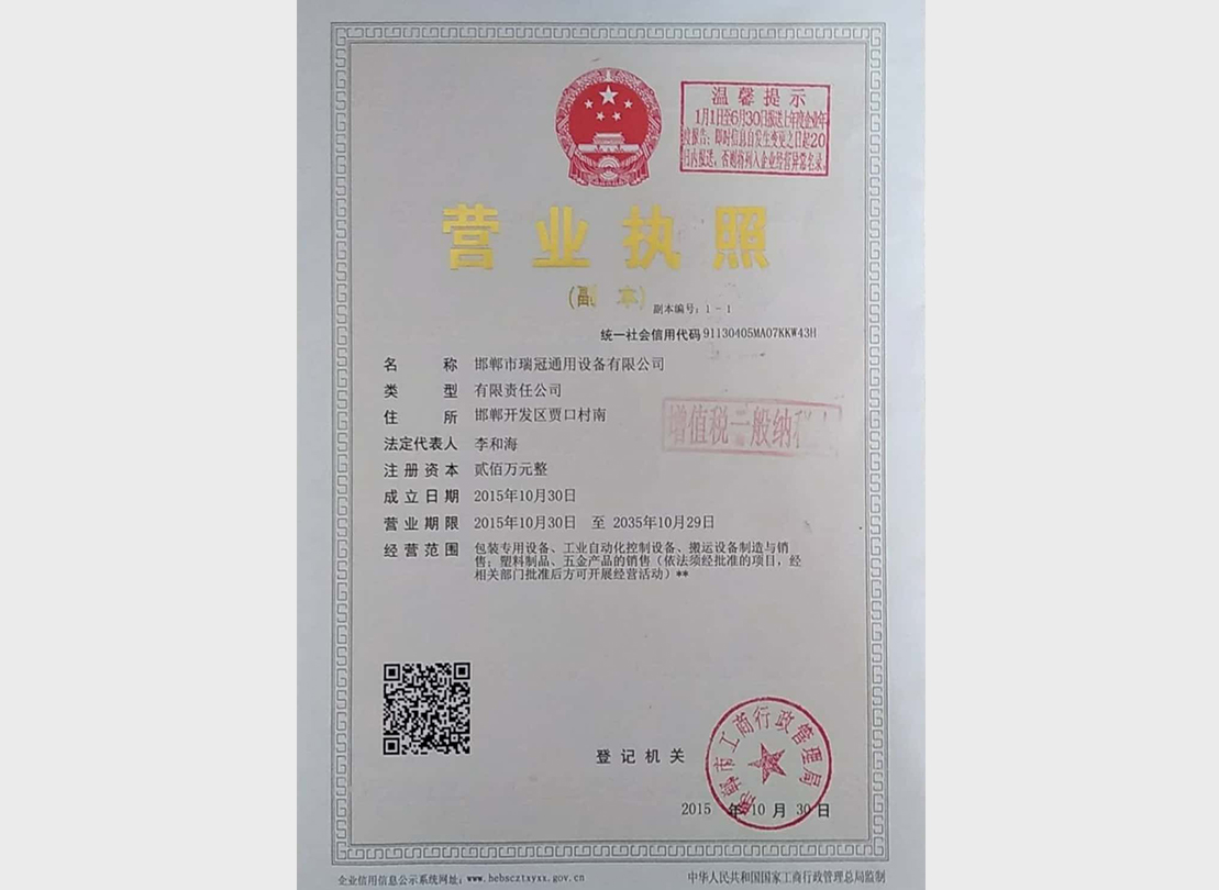 邯鄲市瑞冠智能化裝備有限公司辦公室地址位于具有1萬(wàn)年的歷史和3100年的建城史的邯鄲,邯鄲 邯鄲開發(fā)區(qū)賈口村南,于2015-10-30 在邯鄲工商局注冊(cè)成立,注冊(cè)資本為200萬(wàn)人民幣(萬(wàn)元),公司已經(jīng)公司發(fā)展壯大的5年,愿與社會(huì)各界同仁攜手合作,謀求共同發(fā)展,繼續(xù)為新老客戶提供優(yōu)秀的產(chǎn)品和服務(wù)。我公司主要經(jīng)營(yíng)包裝專用設(shè)備、工業(yè)自動(dòng)化控制設(shè)備、搬運(yùn)設(shè)備制造與銷售;塑料制品、五金產(chǎn)品的銷售(依法須經(jīng)批準(zhǔn)的項(xiàng)目,經(jīng)相關(guān)部門批準(zhǔn)后方可開展經(jīng)營(yíng)活動(dòng)),我公司與多家邯鄲零售商和代理商建立了長(zhǎng)期穩(wěn)定的合作關(guān)系,品種齊全、價(jià)格合理,企業(yè)實(shí)力雄厚,重信用、守合同、保證產(chǎn)品質(zhì)量,以多品種經(jīng)營(yíng)特色和薄利多銷的原則,…
